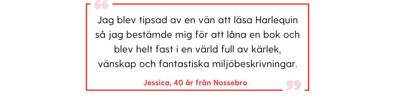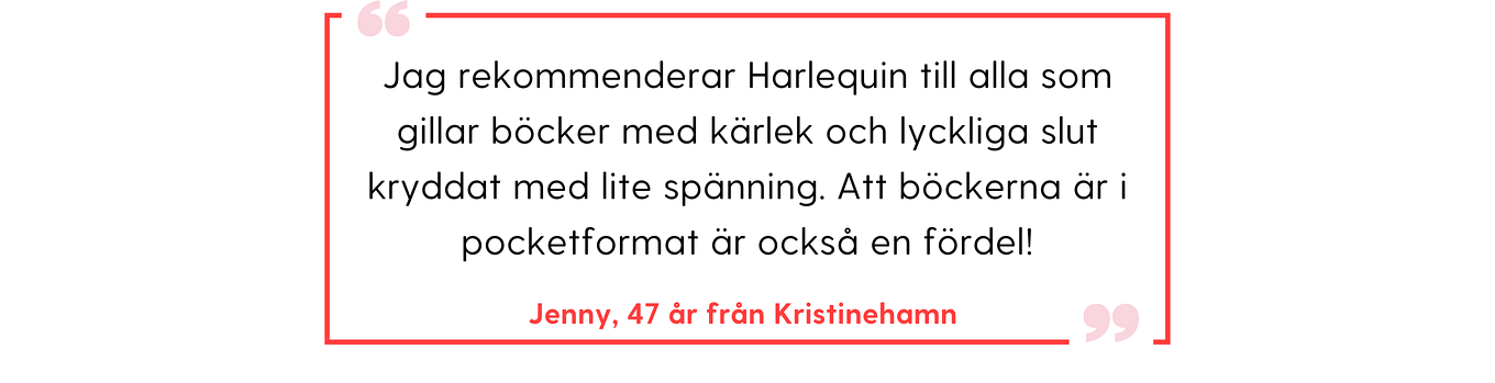 Våra läsare är det viktigaste vi har och vi vill bidra till er läsglädje!Sedan 1979 har vi på Harlequin gett svenska och nordiska läsare möjligheten att läsa verklighetsflyktiga romantikberättelser, med böcker skrivna av kvinnor för kvinnor! Självklart är vårt största syfte att ge er glädje, läsro och avkoppling i vardagen med våra romantikböcker. Här har vi samlat omdömen från våra läsare och deras unika berättelser om Harlequin!